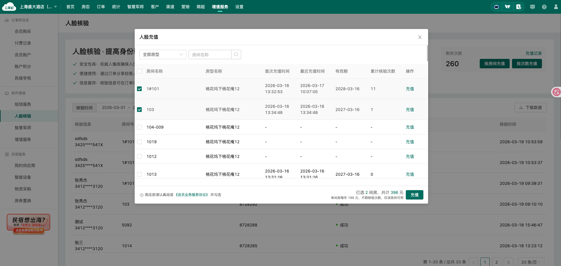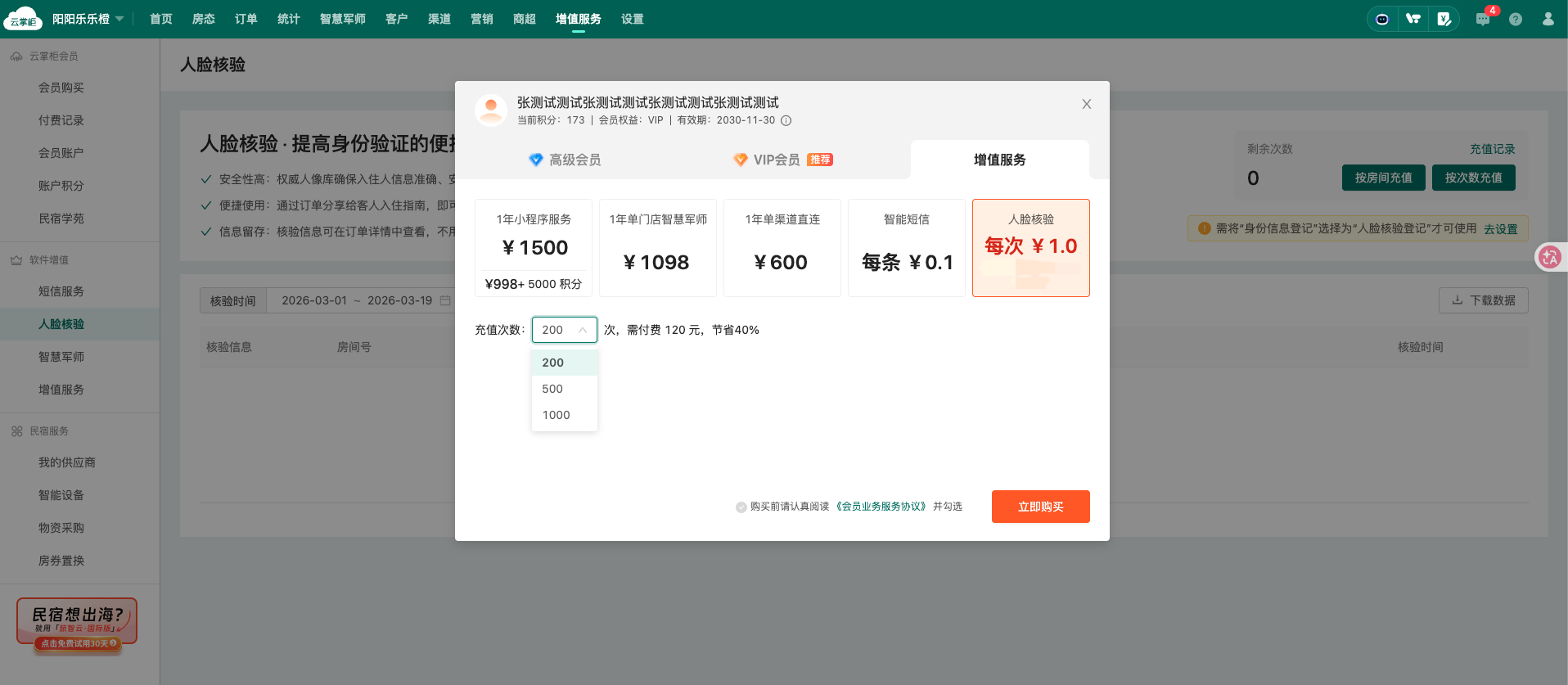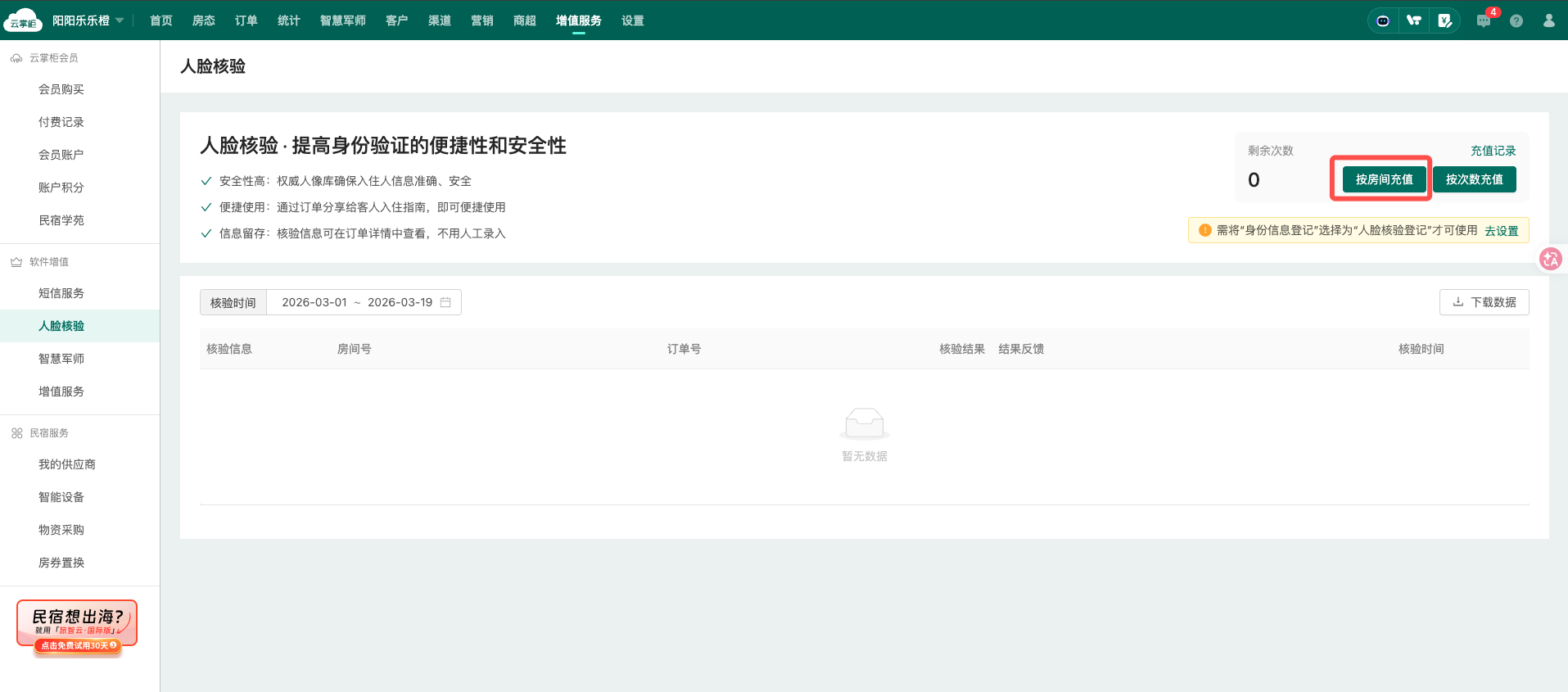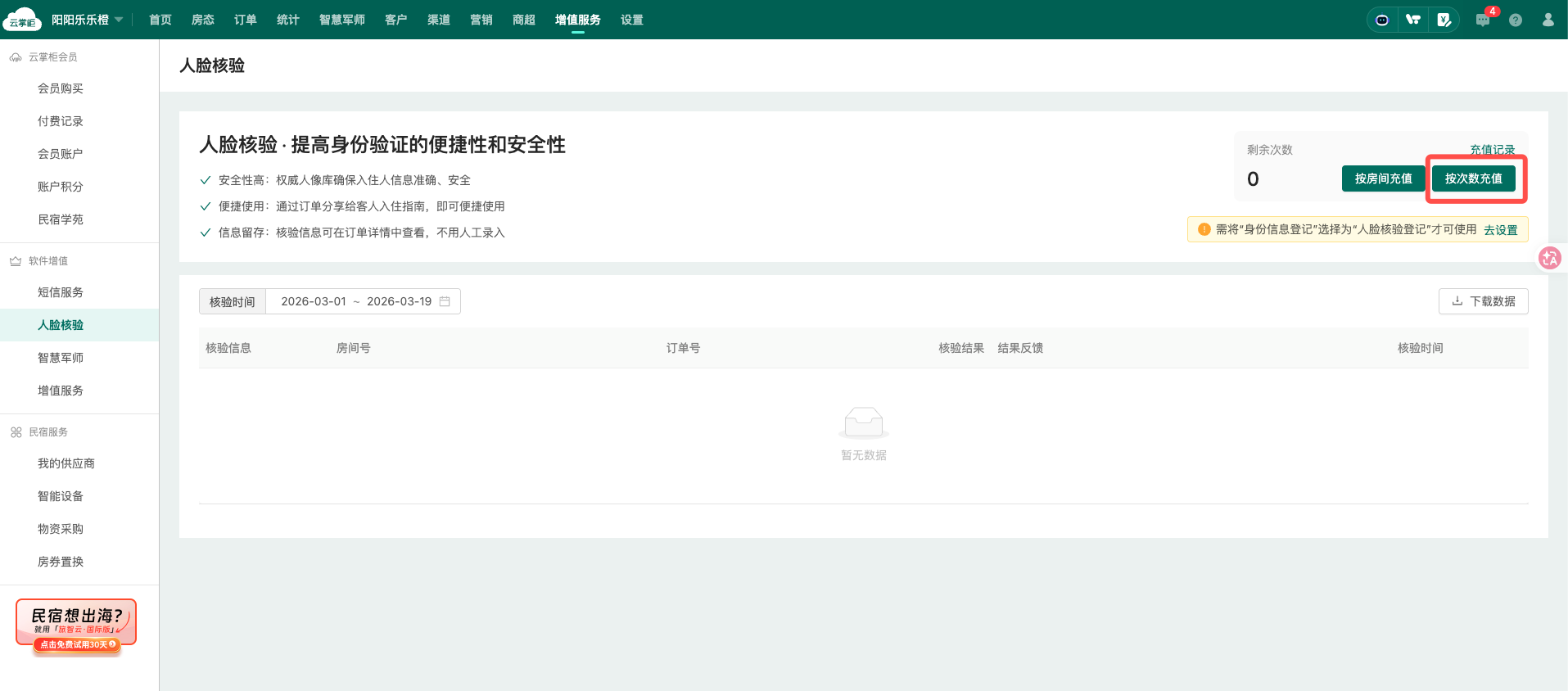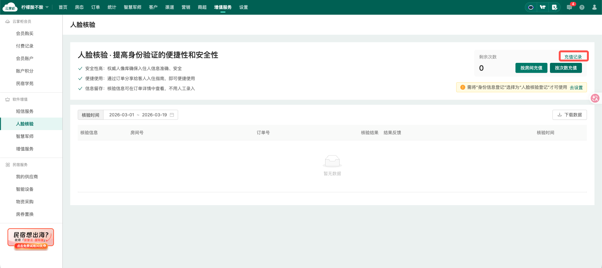可在“增值服务”-“人脸核验”查看使用记录(门店维度)